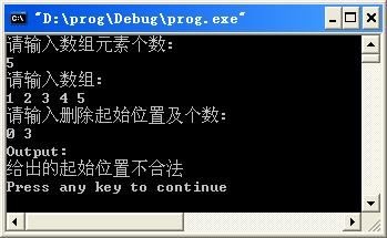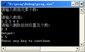 从顺序结构(n个元素)中第i个(1 <= i <= n)位置连续删除k个(k > 0)元素,第1,3,5行为输入提示,第2,4,6行需要用户输入,第8行为输出。