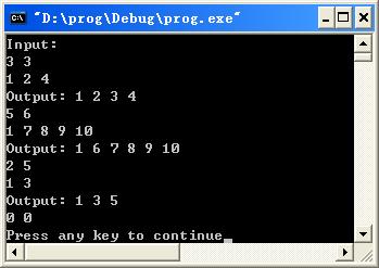 程序的运行效果应类似地如图所示,图中的3 3、1 2 4、5 6、1 7 8 9 10、2 5、1 3和0 0是从键盘输入内容。