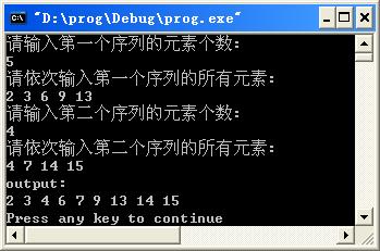 将两个顺序存储的有序(升序)表合并成一个有序表(设用户输入的是有序表,忽略检测用户有序状况的检查),合并后输出。第1,3,5,7行为用户输入提示,2,4,6,8行为用户输入,第10行为输出的结果。