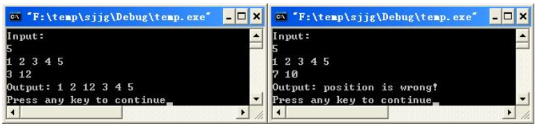 在已知的顺序表中某个位置加入一个元素。图示中第二至四行是键盘输入的,最后一行是输出。第二行表示初始元素的个数。第三行是输入相应元素。第四行是输入需要加入的位置和元素的值(图示合法位置是1到6)。请在/******start******/和/******end******/注释之间添加代码完成插入元素操作。