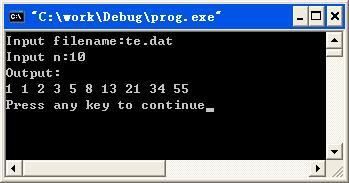 程序功能:将斐波拉契数列的前n项用二进制方式写入自命名文件中,然后从该文件中读取这n个数输出。