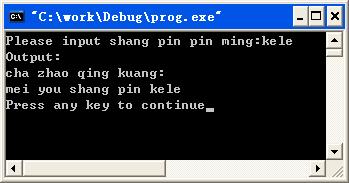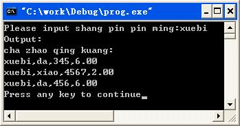 编写一程序实现以下功能 有一存储很多商品数据(每件商品的属性先后包括:品名、规格、数量、单价,编程时相应的数据类型分别定义为字符串char(20)、字符串char(12)、int、float)的二进制文件sp.dat(即未作任何格式转换而直接使用fwrite将商品属性写入文件),从键盘输入某种商品的品名,要求在文件中查找有无相应品名商品(可能有多条记录或没有),若有则在屏幕上显示出相应的商品的品名、规格、数量、单价(显示时,品名、规格、数量、单价之间使用逗号(,)作分隔),若无则显示没有相应品名的商品。 编程可用素材:printf("Please input shang pin pin ming:")...、printf("Output:\ncha zhao qing kuang:\n")...、printf("mei you shang pin :...。 程序的运行效果应类似地如图1和图2所示,图1中的Please input shang pin pin ming:xuebi中的xuebi和图2中的Please input shang pin pin ming:kele中的kele是从键盘输入的内容。